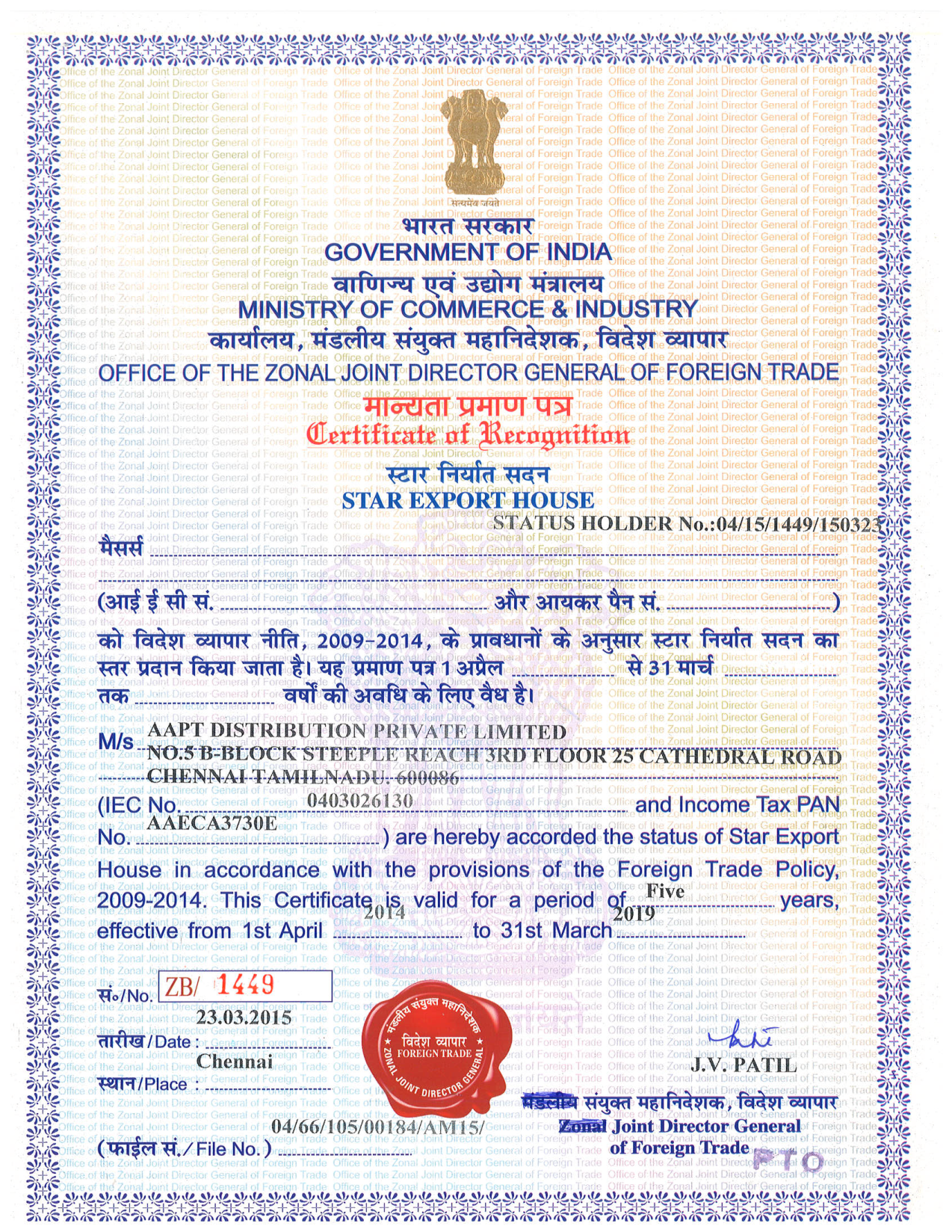 Recognising our contribution to India’s exports to the global markets, we have been assigned the status of "STAR EXPORT HOUSE". |